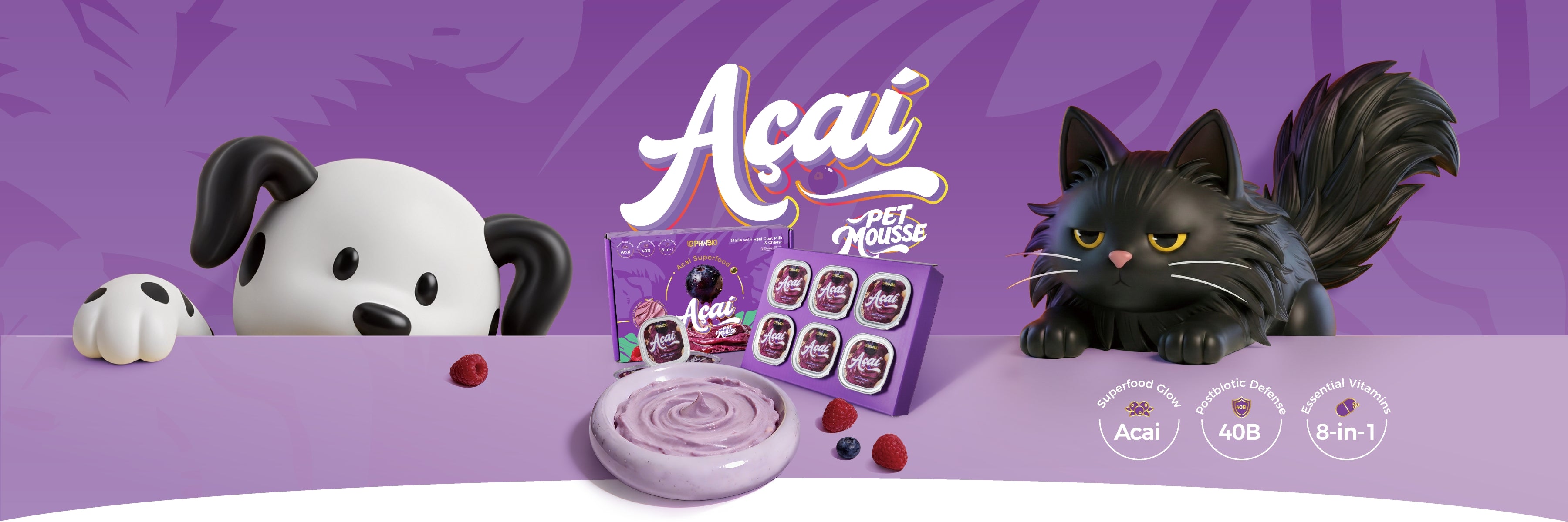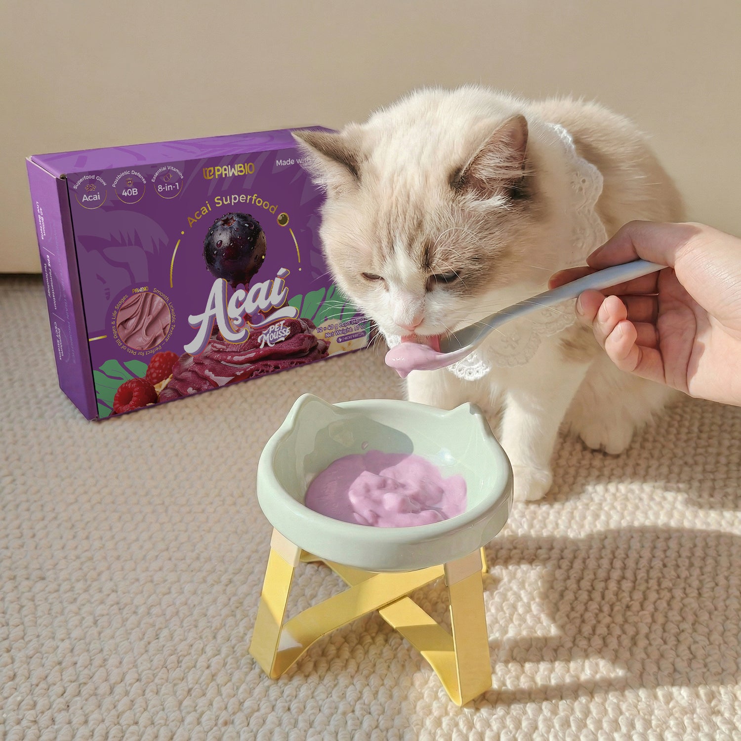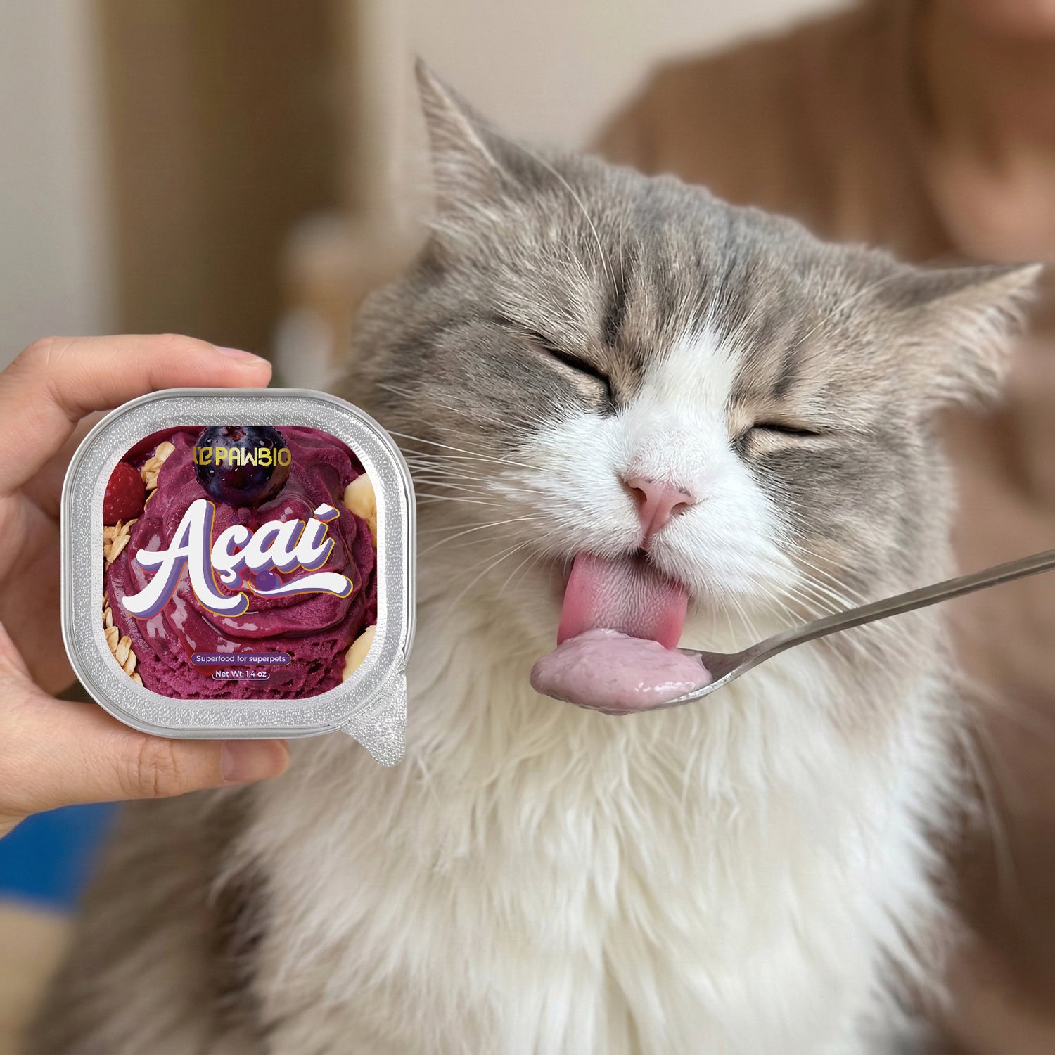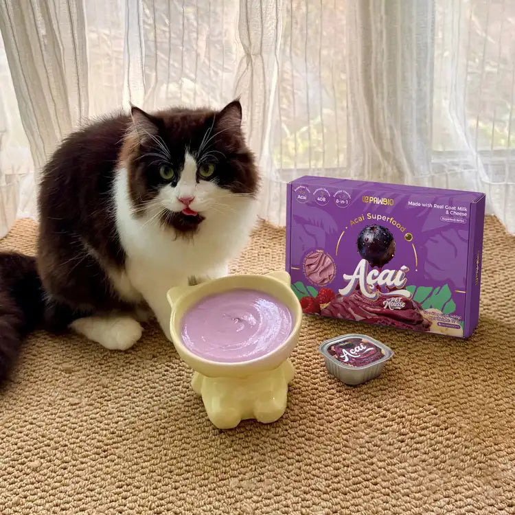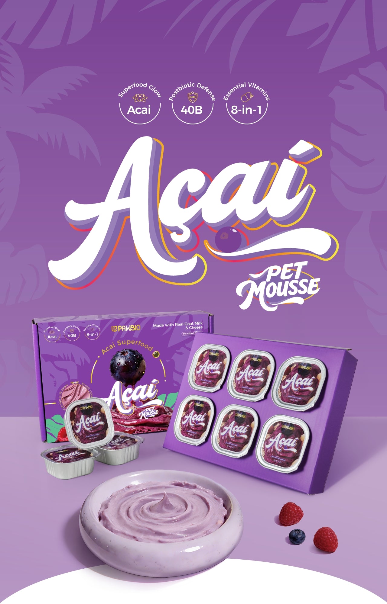 Inspired by the acai bowl craze in human food, our Acai Pet Mousse brings the superfood experience to your furry friend. Packed with human-gradeAcai, Blue Spirulina, and Goat Milk, each bite is a tasty, nutrient-rich boost of energy and vitality.