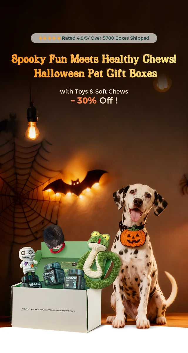 A spooky-season gift box made just for pets! Inside, you'll find 3 vet-approved soft chew supplements plus Halloween toys for dogs or cats, combining wellness and festive fun in one box.